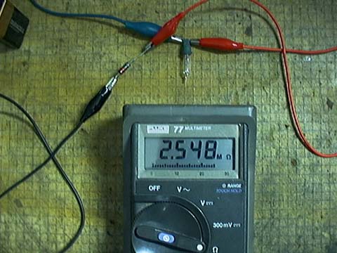 Note that the lightbulb is brightly lit up, though less so than for the short circuit condition above. The meter is displaying 2.3 ohms. In some circumstances, that is a good, low-resistance connection (or an undesirably good short circuit). In others, that is too much resistance, and there may be problems, such as excessive heat generation.